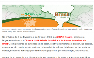 O volume 3 do Estudo Raio-X da Hotelaria Brasileira desvenda números das Redes Hoteleiras presentes no país, sejam de origem nacional ou internacional, a partir de pesquisas implementadas em três formas distintas de apuração: consultas aos sites das Redes e envio de Formulários, que após o primeiro retorno, passaram por avaliação crítica das autoras, que partiram em busca da confirmação de cada detalhe, através de correspondências trocadas com o representante de cada rede analisada, até o fechamento desta edição, evitando-se que qualquer tipo de atualização passasse despercebida.